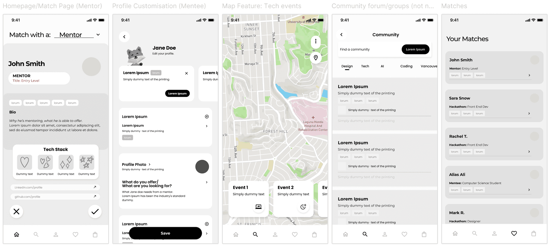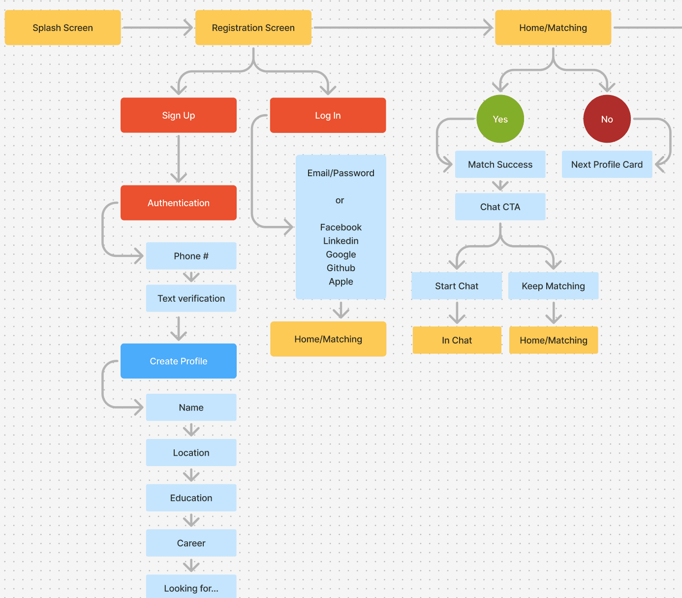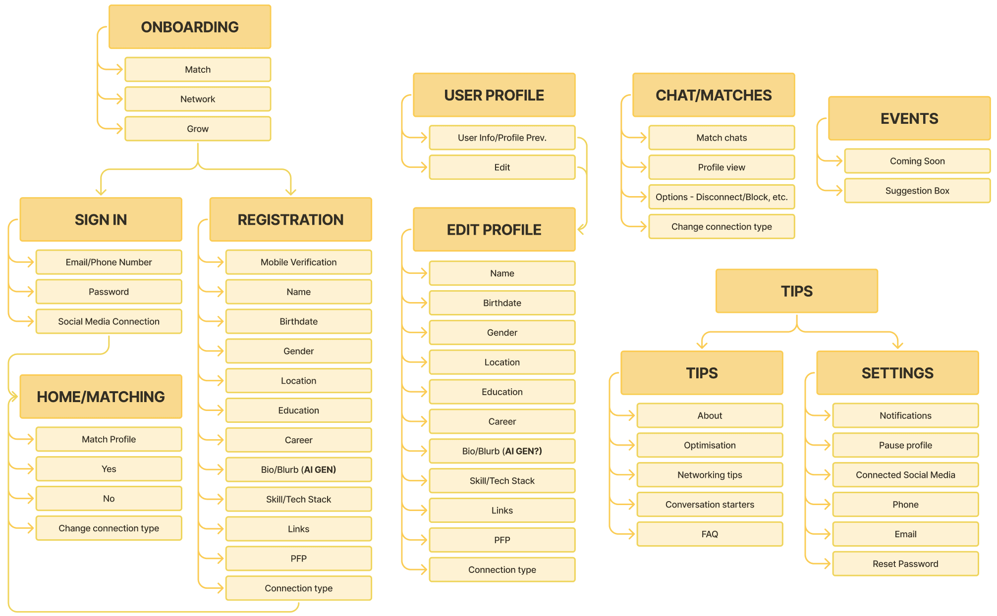 Created a detailed sitemap to organize key user flows such as onboarding, matching, messaging, and profile management. Prioritized intuitive navigation and progressive disclosure to reduce information overload.